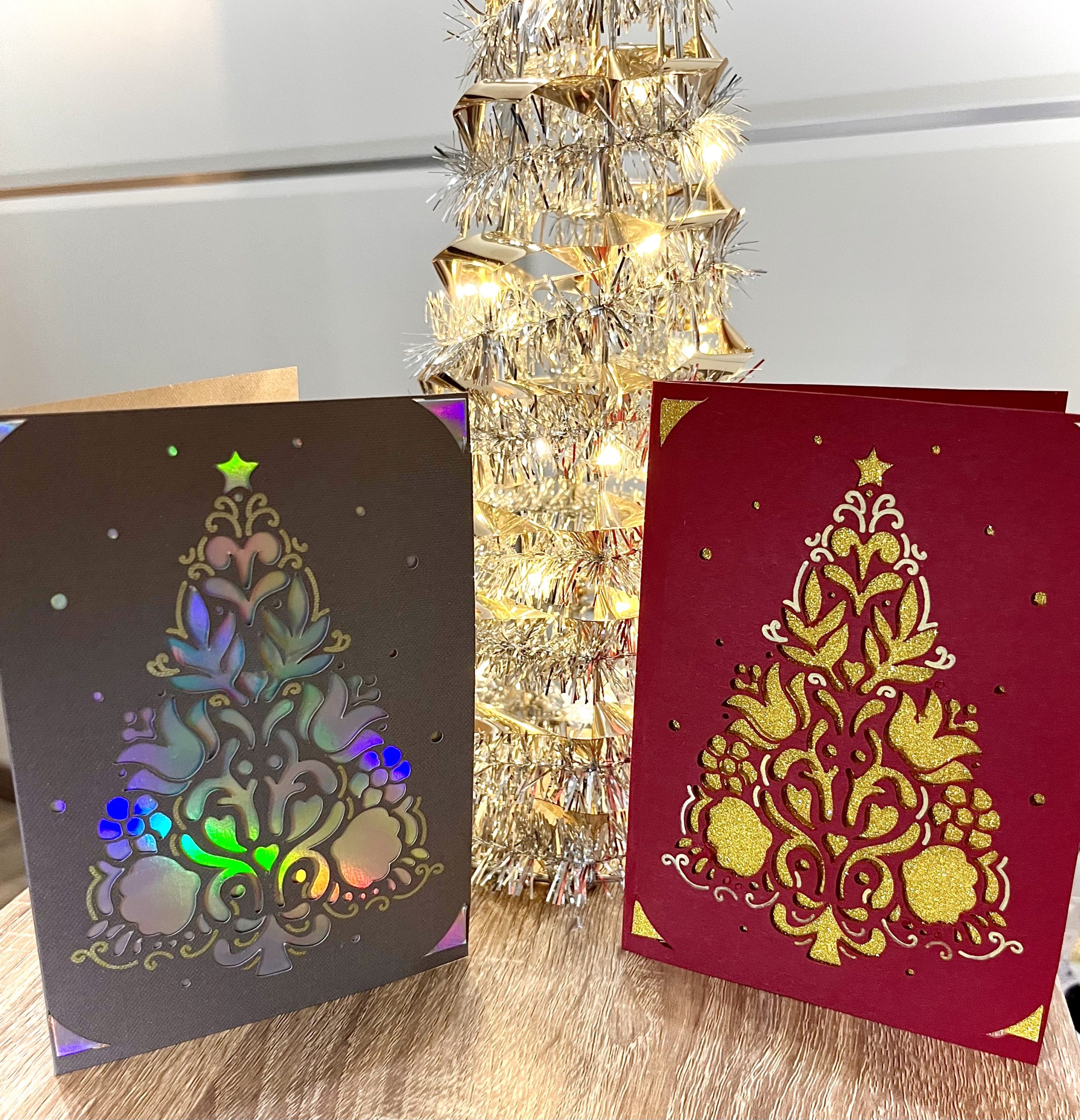 Carte de vœux à insert faite main, en rouge lumineux, ornée d’un sapin doré pour une touche festive et élégante.